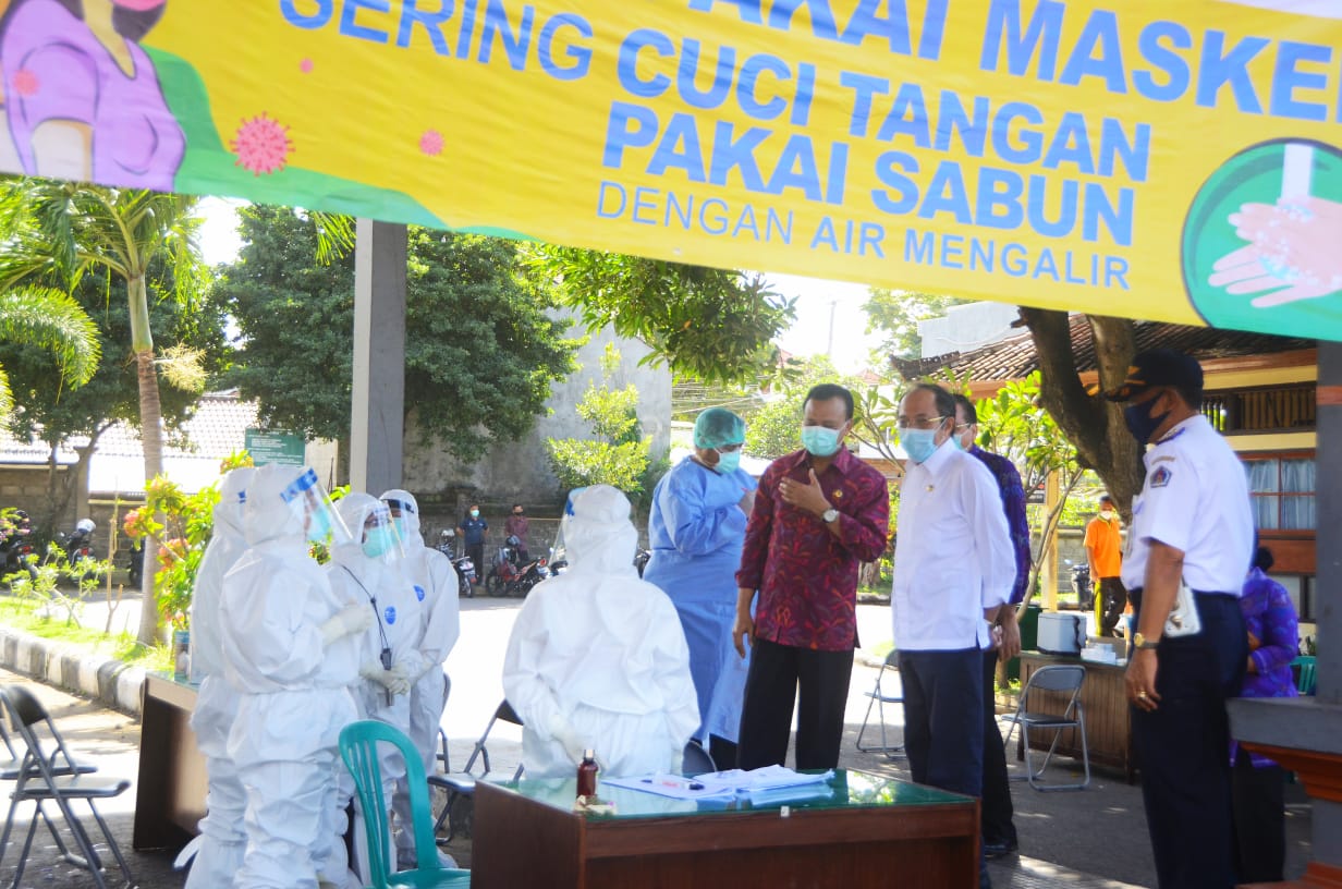Sekda yang juga didampingi Kadis Kesehatan Provinsi Bali Ketut Suarjaya tersebut dalam eksempatan tersebut juga mengecek langsung kesiapan personil kesehatan serta logistik yang ada di lapangan, khususnya kesiapan pihak kabupaten Klungkung. “ Semuanya saya lihat sudah berjalan baik. Satu hal lagi yang saya lihat sangat baik adalah para pedagang jika nanti akan berjualan harus memperlihatkan keterangan non-reaktif dalam rapid test sehingga pilihannya jika ingin terus berjualan harus melakukan rapid test,” tegas Sekda Dewa Indra yang Nampak  pula didampingi Sekda Kabupaten Klungkung, I Gede Putu Winastra serta kepala OPD terkait di lingkup pemkab Klungkung.