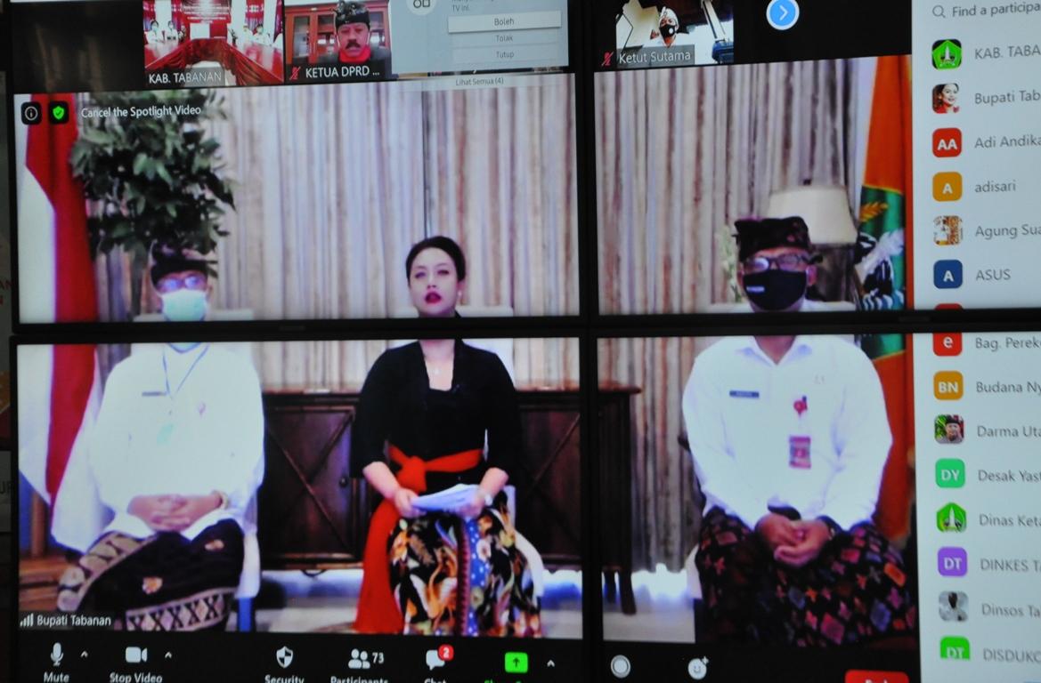 Katabali.com – Tabanan – Bupati Tabanan Ni Putu Eka Wiryastuti melantik dan mengambil Sumpah Jabatan 1 Kepala Dinas, yakni Kepala Dinas PPKB dan 38 Kepala Sekolah di lingkungan Pemkab Tabanan. Pelantikan dilakukan secara online melalui video conference dengan memperhatikan protocol kesehatan pandemic Covid-19, Kamis (9/7).