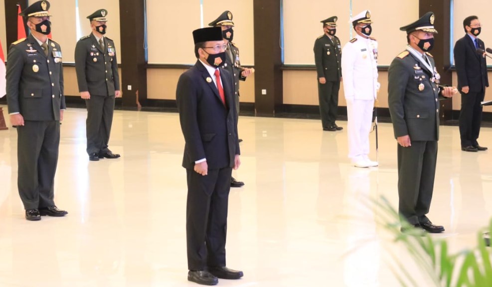 Gubernur Bali Wayan Koster bersama dengan Pangdam IX/Udayana Mayor Jenderal Mayjen TNI Kurnia Dewantara SIP dan jajaran Forkopimda se-Bali mengikuti upacara dari Kodam IX/Udayana, Denpasar.