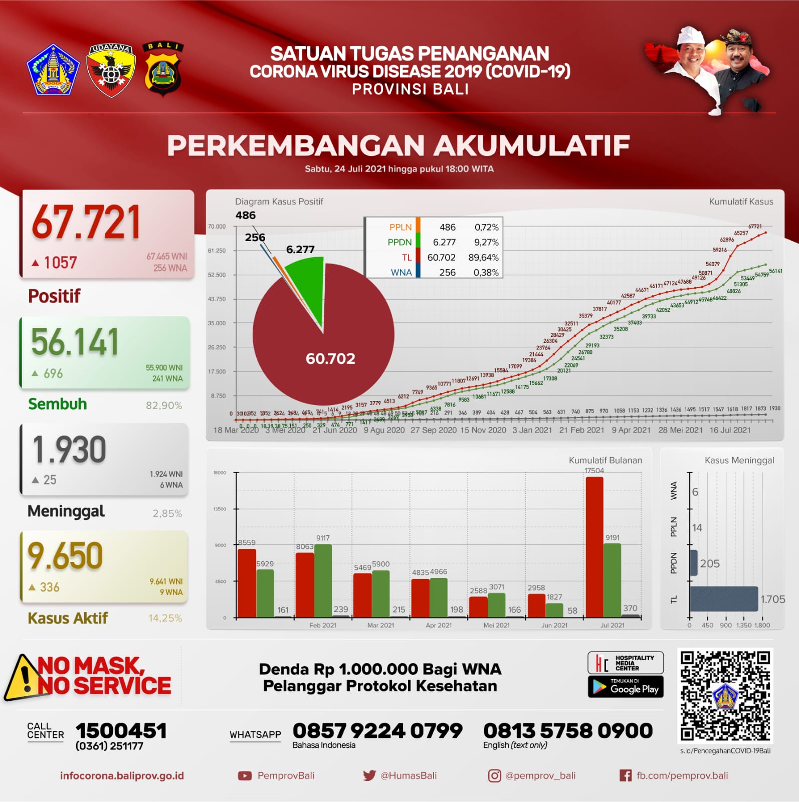 KataBali.com – Denpasar – Pertambahan kasus hari ini sebagai berikut : TERKONFIRMASI sebanyak 1.057 orang (890 orang melalui Transmisi Lokal, 162 PPDN dan 5 PPLN) SEMBUH sebanyak 696 orang dan 25 pasien meninggal dunia.