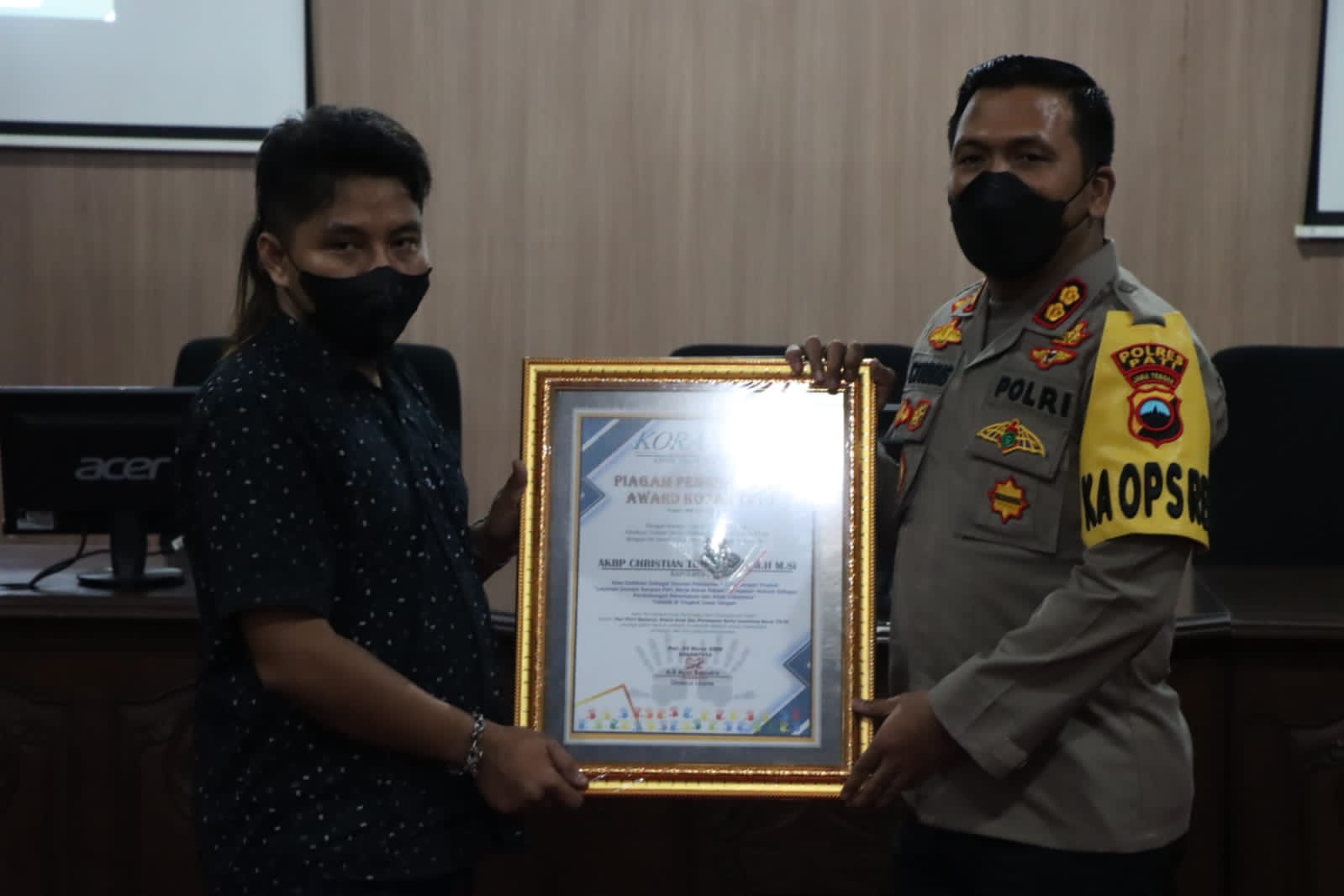 Gambar : Tokoh Terbaik Tingkat Nasional, Sekjen Rumah PPAI Saat Memberikan Penghargaan Award Koran TV10 ke Kapolres Pati AKBP Christian Tobing S.I.K, M.H, M.Si Terkait Pengungkapan Kasus Tindak Pidana Persetubuhan Anak dibawah Umur di wilayah kabupaten Pati Jawa Tengah tahun 2022