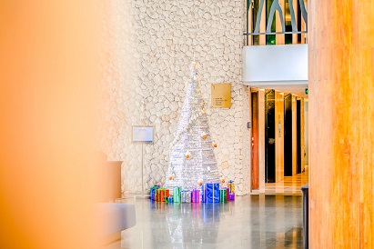 Di area lobi hotel, sebuah Pohon Natal setinggi 2,7 meter berdiri megah dan mencuri perhatian. Namun, yang membuatnya istimewa bukan hanya ukurannya, melainkan cerita di baliknya. Pohon Natal ini dibuat dari bohlam bekas yang sudah tidak terpakai, lalu dihiasi ornamen unik dari tutup botol air mineral dan tutup kontainer jus bekas yang diolah ulang menjadi dekorasi artistik. Sentuhan fairy lights menghadirkan cahaya hangat yang menciptakan suasana syahdu khas Natal.