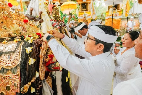 KataBali.com – Badung – Bupati Badung I Wayan Adi Arnawa menghadiri prosesi sakral Karya Ngerehan Ida Bhatara Ratu Bagus Kahyangan Jagat di Pura Dalem Sakenan Munggu, Kecamatan Mengwi, Minggu (18/1). Dalam kesempatan tersebut, Bupati Adi Arnawa berkesempatan melakukan prosesi nyumpangin sekar emas pada sekar taji Ida Bhatara Ratu Bagus sebagai bentuk penghormatan dan bakti.